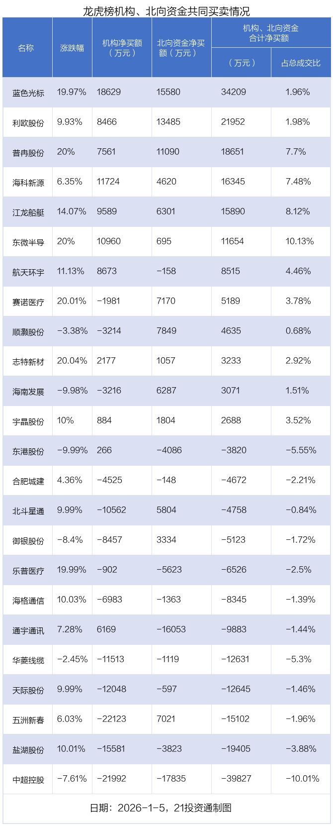 值得注意的是,机构和北向资金共同净买入了蓝色光标、利欧股份、普冉股份、江龙船艇、海科新源、宇晶股份、志特新材、东微半导等8股;共同净卖出了合肥城建、天际股份、华菱线缆、海格通信、盐湖股份、乐普医疗、中超控股等7股;在顺灏股份,赛诺医疗,五洲新春,海南发展,北斗星通,御银股份,航天环宇,东港股份,通宇通讯上出现分歧,机构净卖出顺灏股份3214.02万元,北向资金净买入7848.71万元;机构净卖出赛诺医疗1980.61万元,北向资金净买入7169.85万元;机构净卖出五洲新春2.21亿元,北向资金净买入7020.77万元;机构净卖出海南发展3215.71万元,北向资金净买入6287.05万元;机构净卖出北斗星通1.06亿元,北向资金净买入5803.91万元;机构净卖出御银股份8456.72万元,北向资金净买入3334.12万元;机构净买入航天环宇8673.34万元,北向资金净卖出158.46万元;机构净买入东港股份266.47万元,北向资金净卖出4086.38万元;机构净买入通宇通讯6169.35万元,北向资金净卖出1.61亿元。