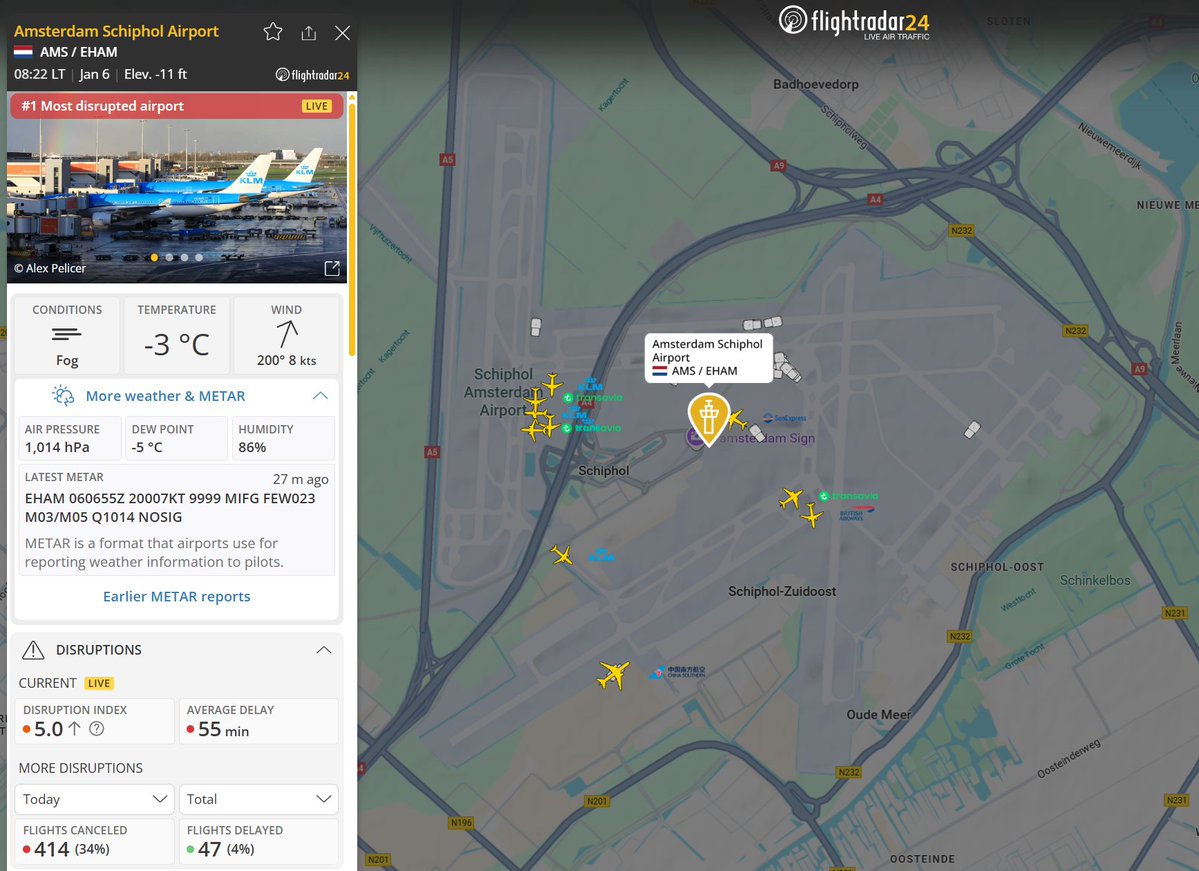 目前,从史基浦机场起飞的航班有超过400个被取消,约航班总量的34%,而1月5日已有超过500个航班被取消。实时航班追踪平台Flightradar24将史基浦机场评为“受影响最严重机场”第一名,并预测1月6日全天的取消率将攀升至50-60%。