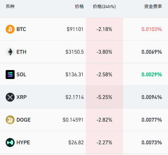 加密货币市场热门币种多数下跌,截至北京时间7:00左右,比特币跌超2%,报91101美元/枚;最近24小时,全球共有超过9.6万人被爆仓。