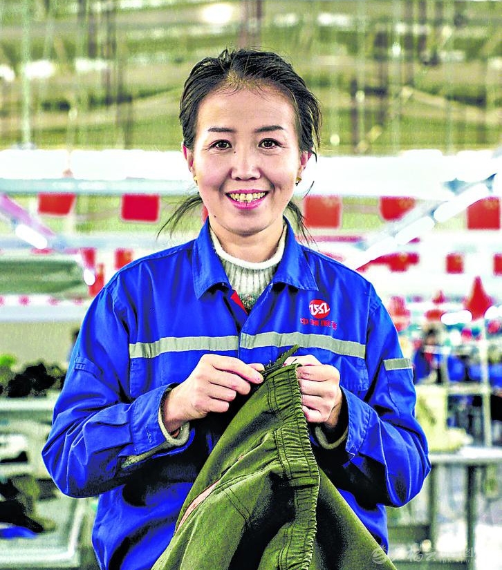 阿合奇县中顺服装厂工人 加哈力·马坎:希望跟着师傅学好缝纫技术,日子越过越红火。古丽加玛力·艾萨摄