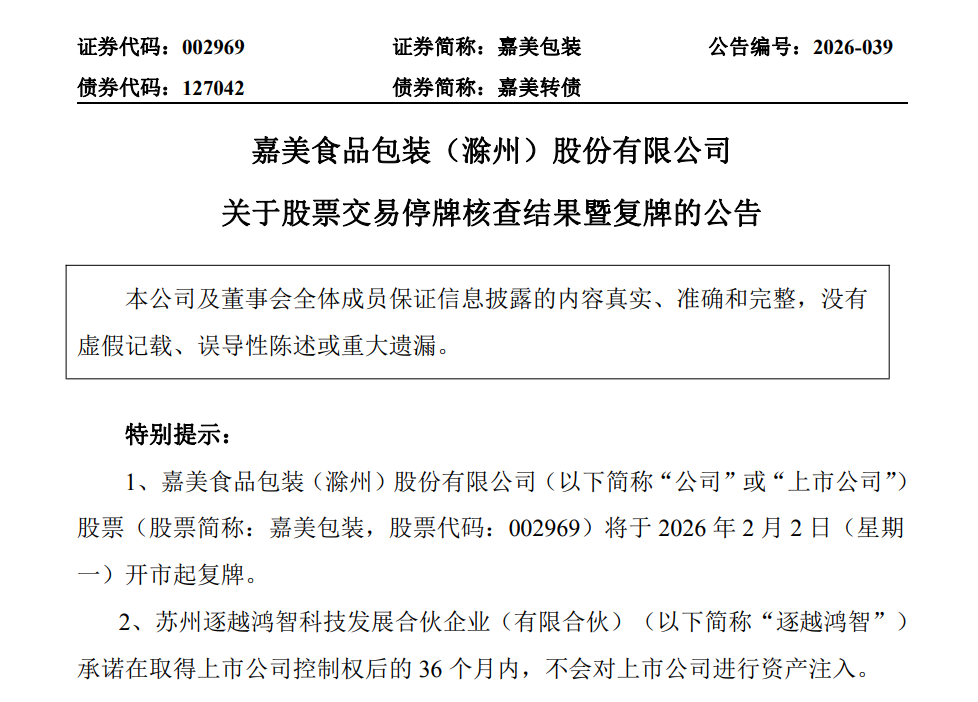 另外,2月1日下午,嘉美包装(002969.SZ)公告称,公司股票自2025年12月17日至2026年1月23日期间价格涨幅为408.11%,已背离公司基本面。停牌期间,公司就股票交易波动情况进行了核查。相关核查工作已完成。公司不涉及机器人、扫地机器人相关业务,主营业务仍为食品饮料包装容器的研发、设计、生产和销售及提供饮料灌装服务。公司预计2025年度实现归属于上市公司股东的净利润为8543.71万元至10442.31万元,比上年同期下降53.38%至43.02%。公司股票最新市净率、市盈率显著高于行业平均水平,未来可能存在股价快速下跌的风险。公司预计未来12个月内主营业务不会发生重大变化。公司股票自2月2日起复牌。