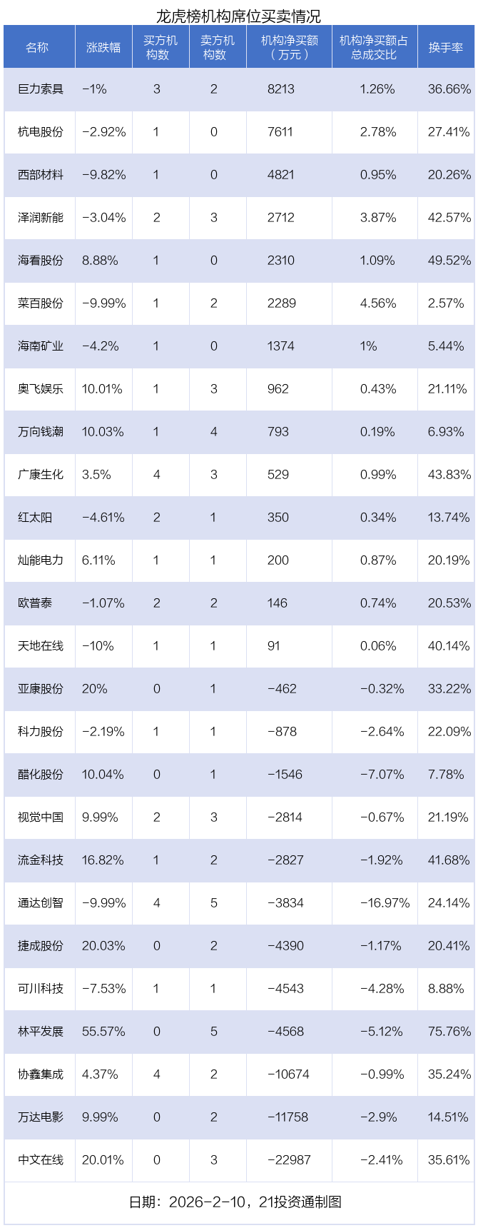2月10日,26只个股龙虎榜出现了机构的身影,机构合计净卖出3.89亿元。具体来看,机构净买入14股,净卖出12股。