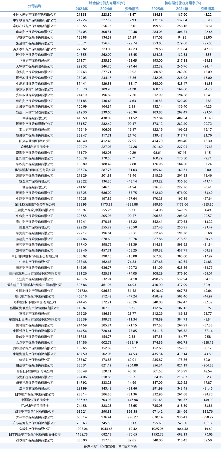 财产险公司的偿付能力指标在2025年总体保持稳定,绝大部分公司的资本充足水平远高于监管要求。