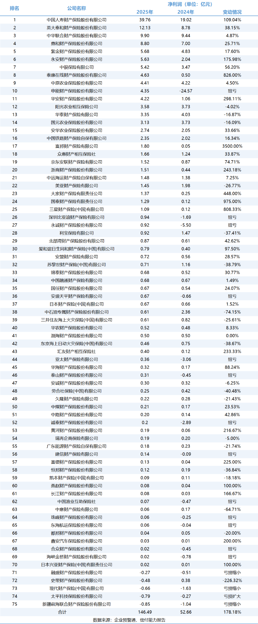 2025年财产险行业的盈利能力显著增强,已公布数据的75家财险公司合计实现净利润约146.49亿元,同比增长178.18%,呈现强劲反弹趋势。