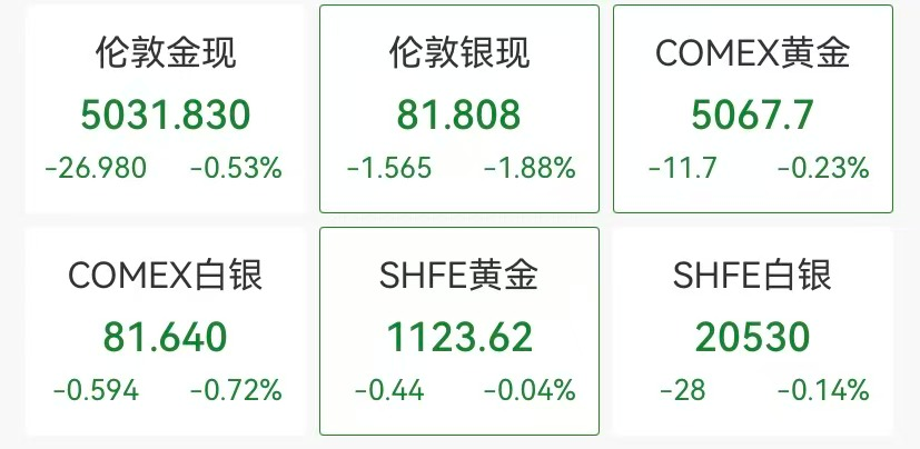 截至北京时间23:00,现货白银跌近2%,失守82美元关口,现货黄金跌约0.5%,回落至5030美元附近,早间最高一度触及5078美元。