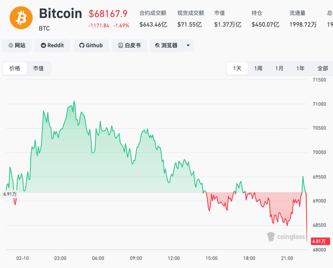比特币短线跳水,目前跌幅扩大至1.69%,报68167.9美元/枚,Coinglass数据显示,最近24小时,全球共有超9.96万人被爆仓。