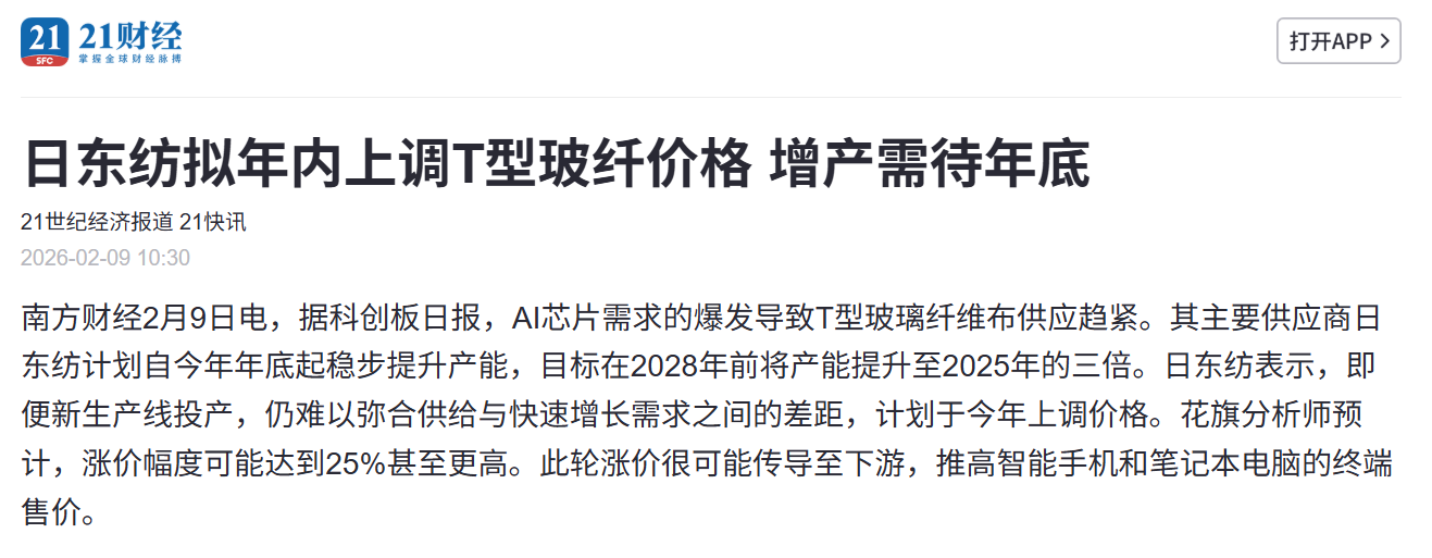 消息面上,华泰证券指出,2月4日光远新材、国际复材等玻纤龙头对电子布再度提价,新一轮提价幅度较大且周期缩短,体现电子布紧缺态势从高端产品向普通产品扩散。