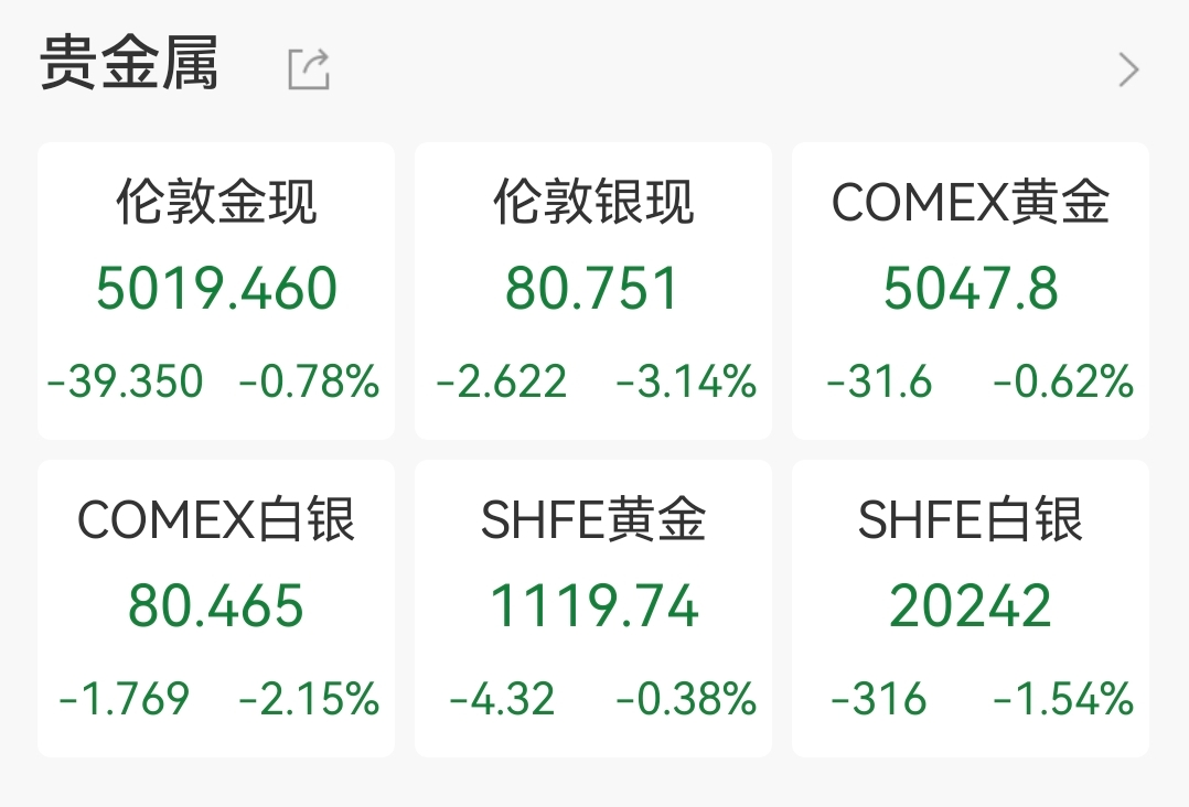 商品方面,2月10日国际黄金盘中波动加大。截至发稿,现货黄金日内跌0.78%报5019.46美元/盎司,现货白银跌超3%报80.57美元 /盎司, 金银比维持在60附近 。期货方面,COMEX黄金期货收跌0.62%,COMEX白银期货收跌2.15%。