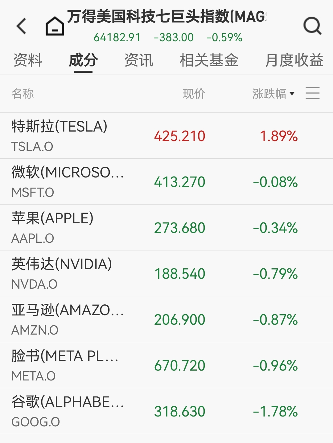 美国大型科技股多数下跌,万得美国科技七巨头指数下跌0.59%。个股方面,仅特斯拉上涨,涨近2%,脸书、亚马逊、英伟达跌近1%。甲骨文涨超2%,博通跌超1%。