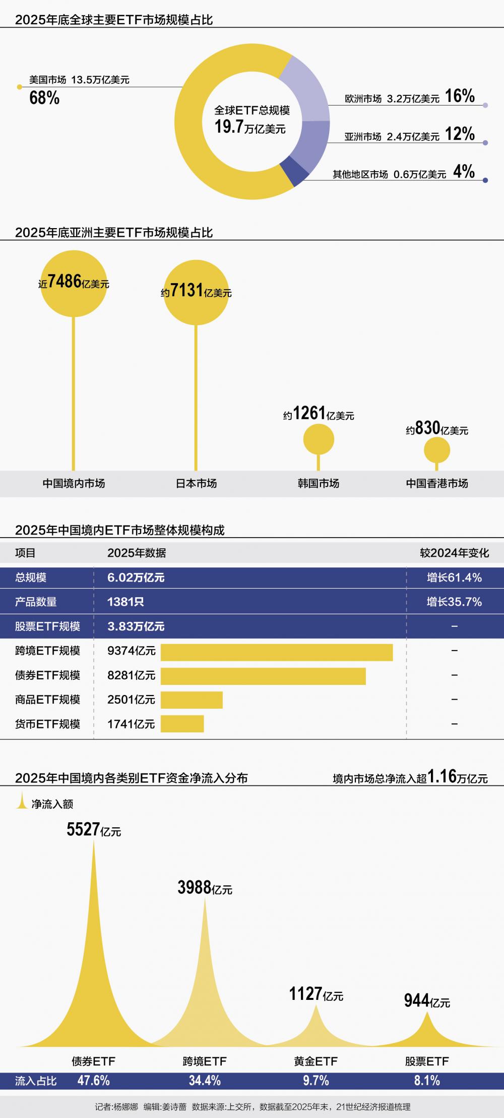2月6日,上交所和深交所分别发布《ETF行业发展报告(2026)》《ETF市场发展白皮书(2025年)》。综合两份报告来看,中国ETF市场以令人惊叹的加速度,在2025年内接连突破4万亿、5万亿、6万亿元三个万亿台阶,最终以6.02万亿元的体量,历史性地超越日本登顶亚洲第一。