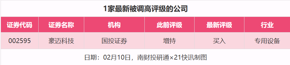 评级调高方面,2月10日,券商调高上市公司评级达到1家次,最新数据包括了国投证券对豪迈科技的评级从“增持”调高至“买入”。