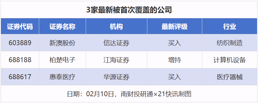 首次覆盖方面,2月10日券商共给出了3次首次覆盖,其中新澳股份获得信达证券给予“买入”评级,柏楚电子获得江海证券给予“增持”评级,惠泰医疗获得华源证券给予“买入”评级。