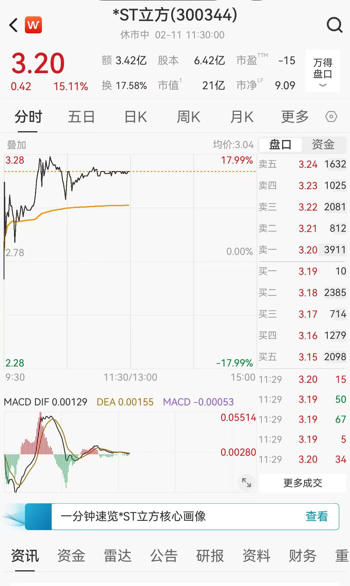 11日早盘,*ST立方再度大幅高开,该股最高涨幅超17%,截至午间收盘,涨幅达到15.11%,报3.20元/股。