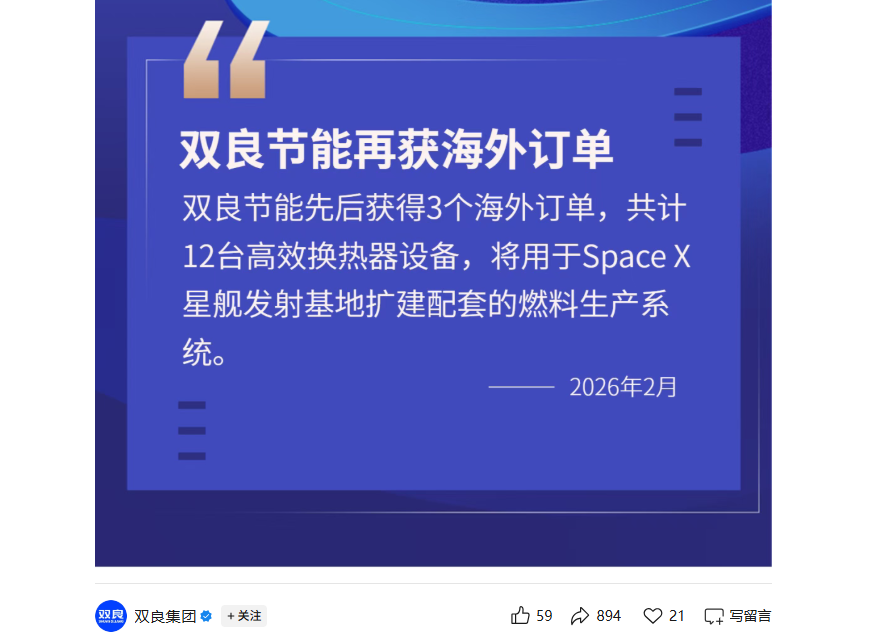 双良节能(600481.SH)发布关于海外订单的说明,2月12日,公司在微信公众号发布了一篇名为《双良节能再获海外订单,助力商业航天太空探索》的市场快讯,文中提及“公司先后获得3个海外订单,共计12台高效换热器设备,将用于Space X星舰发射基地扩建配套的燃料生产系统”。
