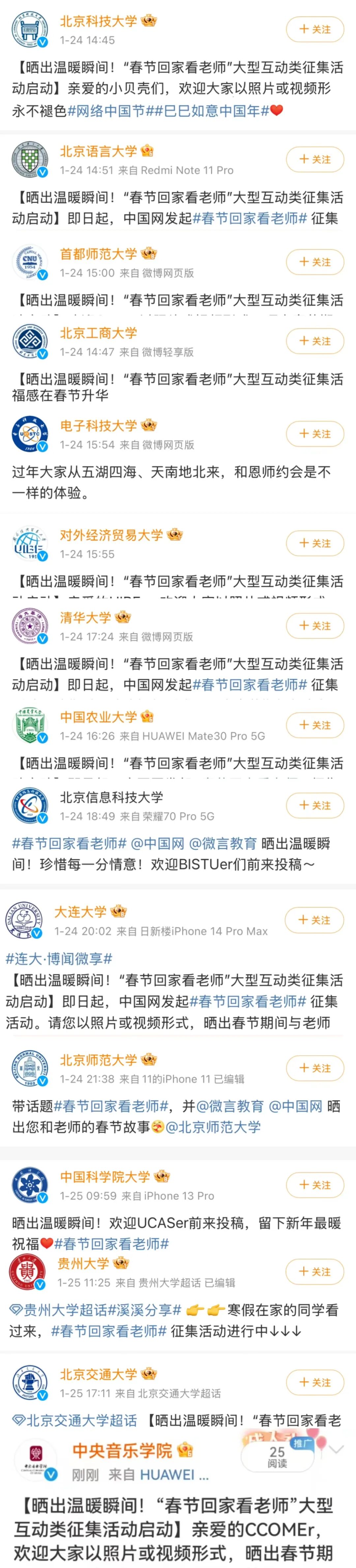 微博话题#春节回家看老师阅读量累计突破 数亿 ,一度冲上 热搜榜前三 。数十所高校与多家主流媒体联动响应,汇聚成一场对师恩的集体致敬。