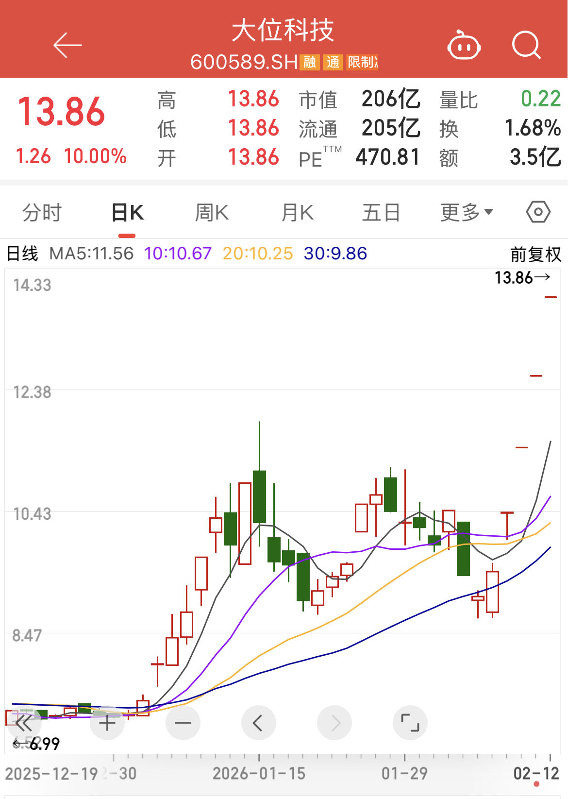 2月12日,A股算力租赁概念板块延续强势行情,板块内多只个股涨幅居前。被市场划入算力租赁概念股的大位科技(600589.SH)当日再度一字涨停,收获连续4个涨停板,截至收盘报13.86元/股,创上市以来新高,总市值突破200亿元。今年以来,公司股价累计涨幅已达93.58%。