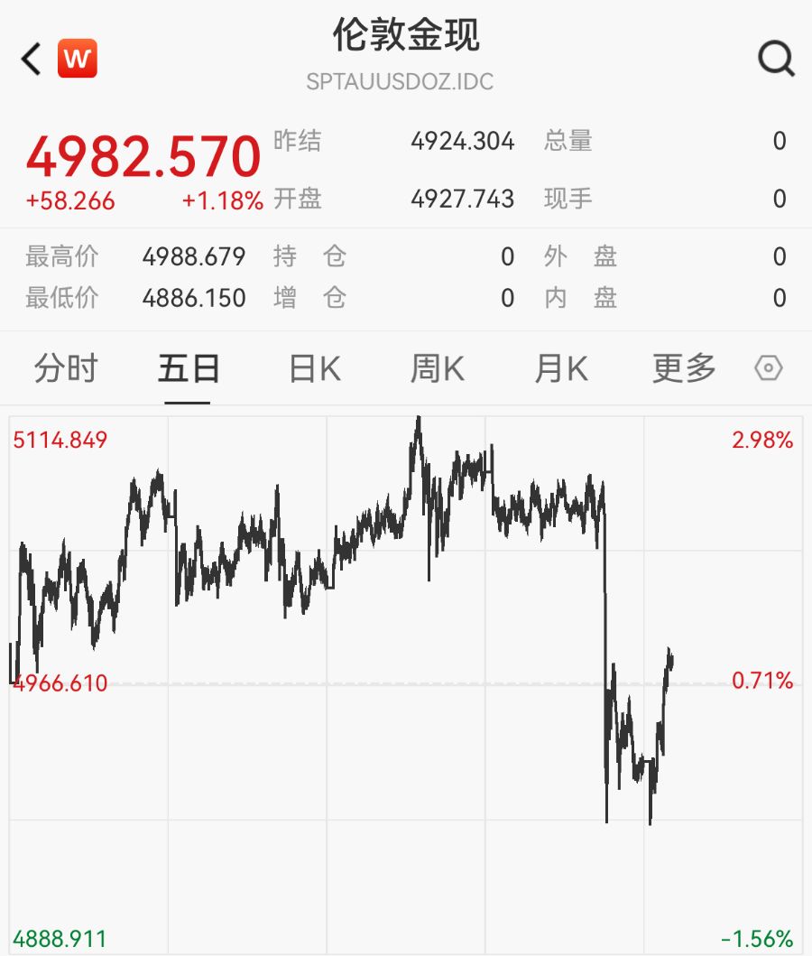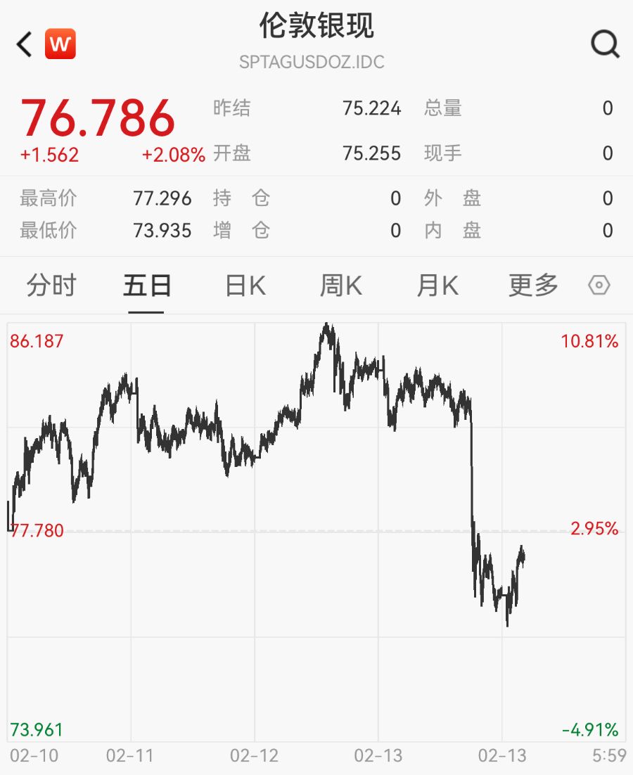 消息面上,当天凌晨,国际贵金属突然大幅下挫,现货白银直线跳水跌超10%,跌破75美元关口。现货黄金现跌近4%,跌破4900美元/盎司。截至10:25,现货黄金反弹站上4980美元关口,现货白银重回75美元。