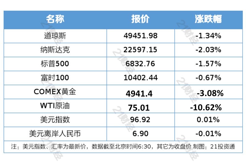 1、美国三大股指全线收跌,道指跌1.34%报49451.98点,标普500指数跌1.57%报6832.76点,纳指跌2.03%报22597.15点。思科跌超12%,迪士尼跌逾5%,领跌道指。万得美国科技七巨头指数跌2.2%,苹果跌约5%,脸书跌近3%。纳斯达克中国金龙指数跌3%,腾讯音乐跌超10%,贝壳跌近6%。科技股领跌,标普指数连续第三个交易日下滑。