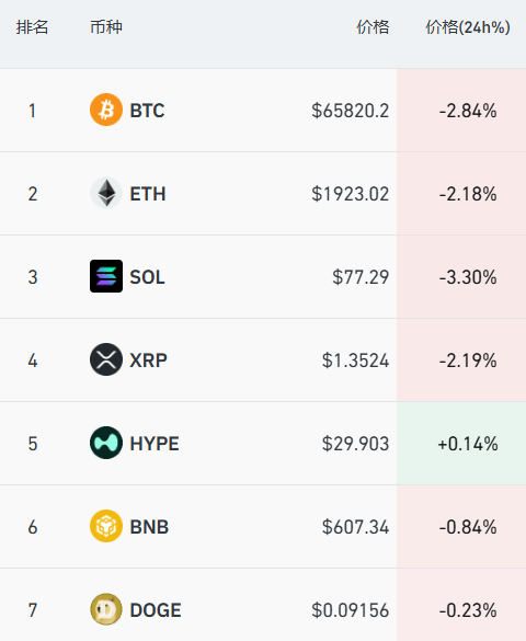 加密货币主要币种下跌,比特币跌近3%,报6.58万美元/枚,过去24小时全市场超11万人爆仓。