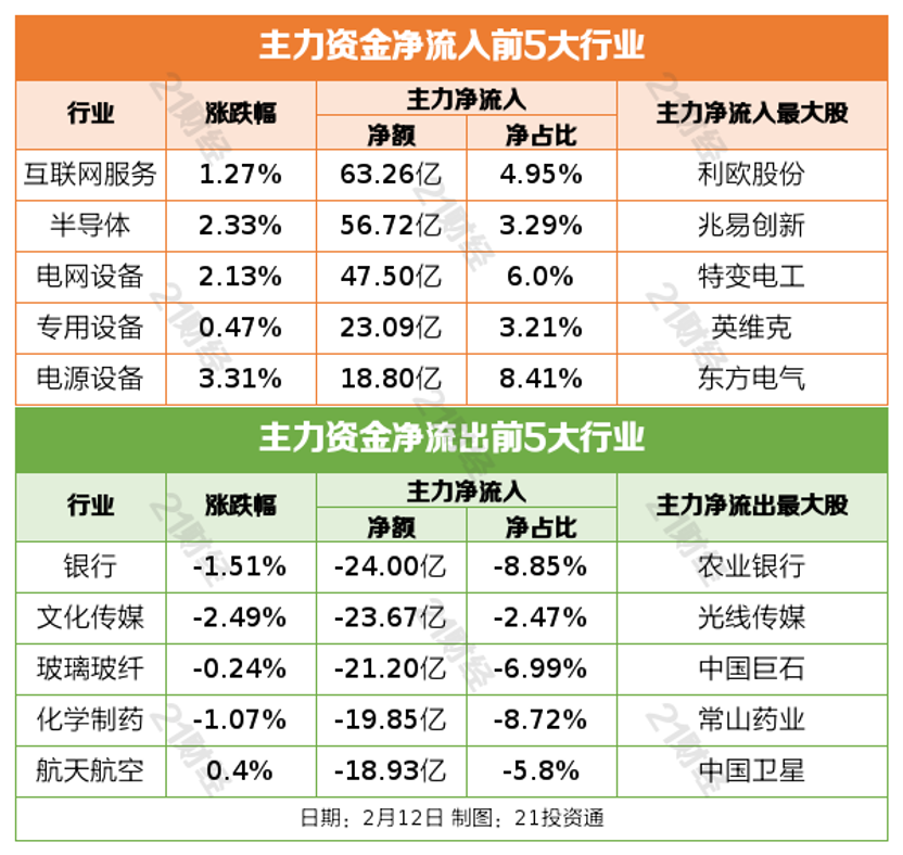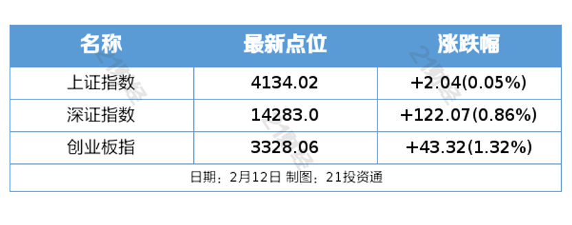 2月12日,三大指数集体收涨,创业板指、科创50指数均涨超1%。大小指数分化,微盘股指数跌超1%。截至收盘,沪指涨0.05%,深成指涨0.86%,创业板指涨1.32%。沪深两市成交额2.14万亿,较上一个交易日放量1575亿。全市场超3200只个股下跌。