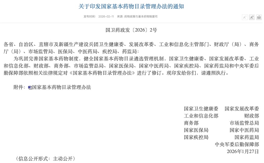 2月11日,国家卫健委等11部门联合印发《国家基本药物目录管理办法》(简称《办法》),正式替代2015年版管理办法。