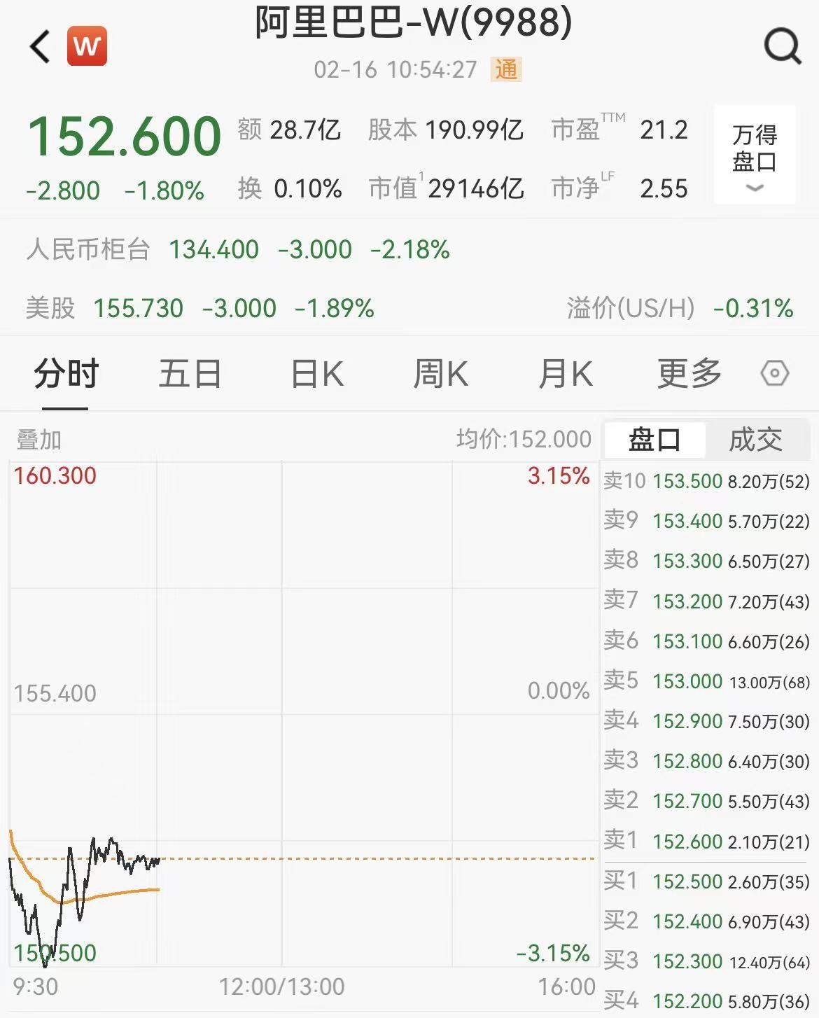 16日上午港股开盘,截至发稿,阿里巴巴- W(09988.HK)跌1.80%,报152.6港元。其中港股AI应用股走强,海致科技集团(02706.HK)涨25.7%、阜博集团(03738.HK)涨9.25%、MINIMAX-WP(00100.HK)涨15.29%。