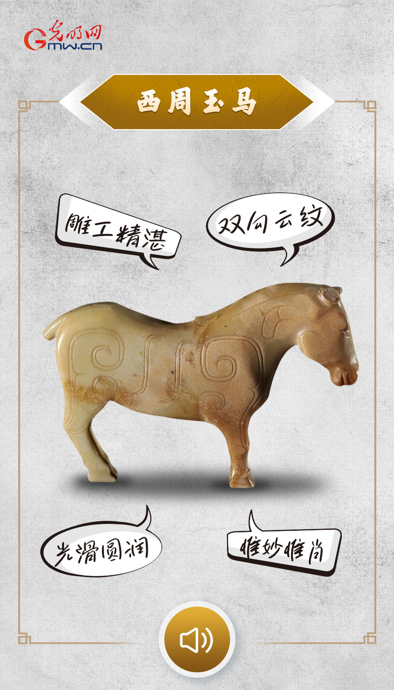 西周玉马现藏于山西博物院,高5厘米,宽7.7厘米。出于晋侯墓地63号墓。灰白色圆雕。马颈项粗壮,鼻翼翕张,胸肌略鼓,臀腹紧圆,颇符解剖原理。婉转柔和的双勾阴线云纹表现马的肌理轮廓,兼具写实与装饰之美。