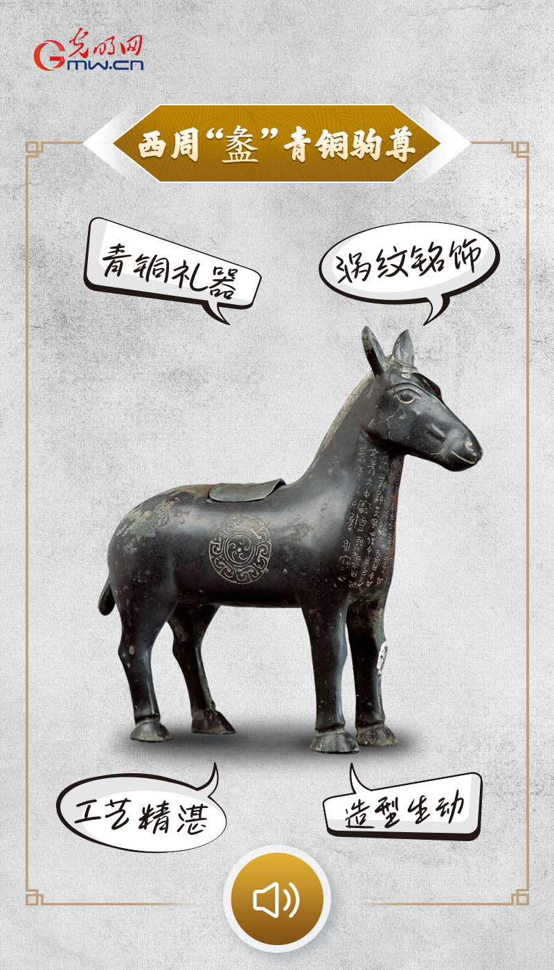 西周“盠”(lí)青铜驹尊现存于中国国家博物馆。器作昂首站立的马驹形,竖耳短鬃,垂尾。腹腔中空,背有长方口,上置小盖,盖上有兽钮。腹侧饰涡纹。颈、胸部铸有铭文9行94字(含重文2字),器盖内铸有铭文3行11字。铭文记述在十二月甲申日早晨,周王在欣地举行执驹礼,赏赐蠡两匹马驹,蠡称颂周王没有忘记旧族,颂扬周王的美德,蠡为祭享父亲大仲作了这件宝尊彝。此尊造型栩栩如生,显示了西周时期高超的铸造工艺。