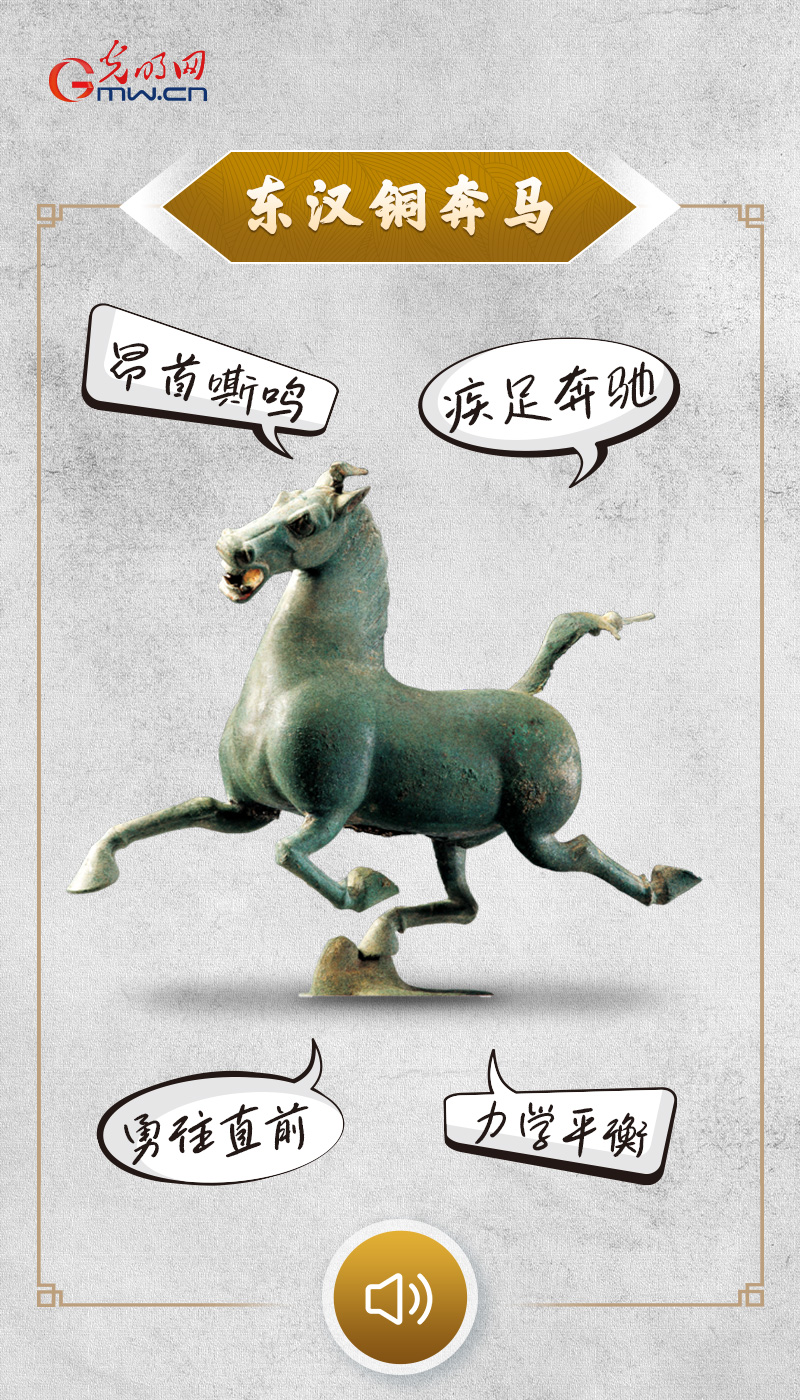 东汉铜奔马现藏于甘肃省博物馆,通高34.5厘米,长45厘米,宽13.1厘米,重7.3千克,造型矫健精美,作昂首嘶鸣,疾足奔驰状,显示了一种勇往直前的豪情壮志,是中华民族伟大气质的象征。奔马三足腾空、一足超掠飞鸟的瞬间,飞鸟回首惊顾,更增强奔马急速向前的动势,全身的着力点集注于超越飞鸟的一足之上,准确地掌握了力学的平衡原理,具有卓越的工艺技术水平。