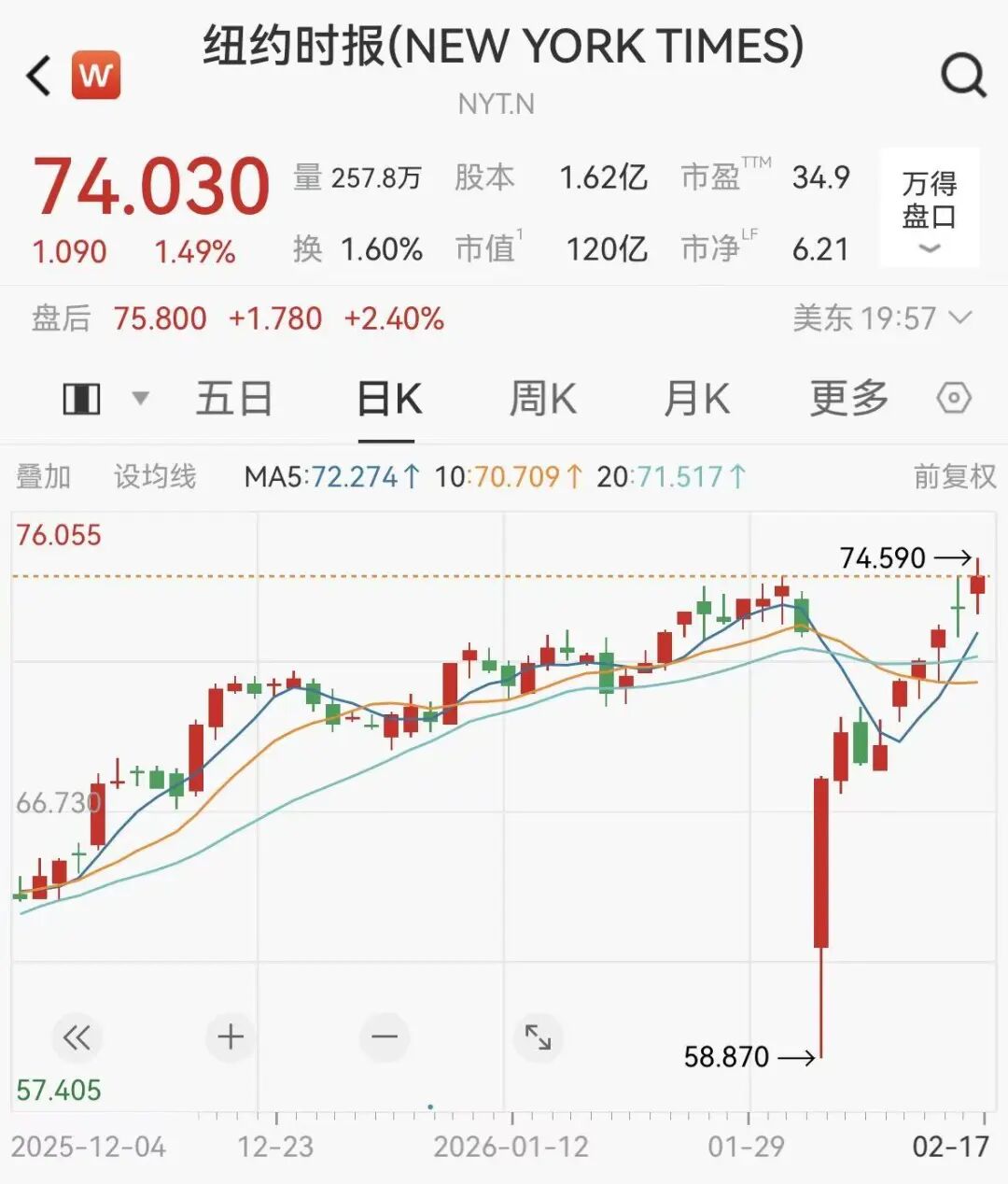 纽约时报股价近期表现强劲,2026年以来上涨近7%,目前接近历史高点74.59美元,过去12个月累计涨幅达50%。伯克希尔13F文件披露后,纽约时报美股股价在盘后交易中涨超2%。