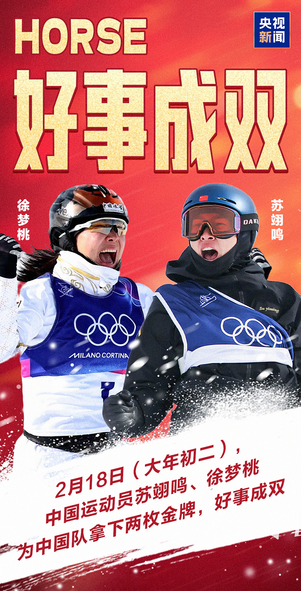 北京时间2月18日,米兰-科尔蒂纳冬奥会单板滑雪男子坡面障碍技巧决赛,22岁的中国选手苏翊鸣在自己的生日当天,凭借第一轮得分82.41的成绩获得冠军,为中国体育代表团夺得本届冬奥会首枚金牌。紧接着,中国选手徐梦桃以112.90分夺得米兰-科尔蒂纳冬奥会自由式滑雪女子空中技巧金牌。中国代表团在一晚夺两金!这份荣耀背后是两位运动员对冰雪运动日复一日的热爱与坚持。