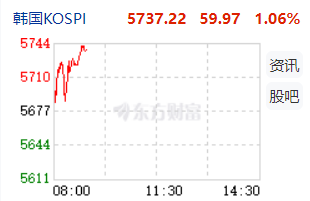 韩国综合指数涨1.06%报5737.22点,再创历史新高。权重股方面,韩华宇航涨超5%,未来资产证券、 韩亚金融集团涨超2%,友利金融集团涨、KB金融集团涨超1%;SK SQUARE跌超1%。
