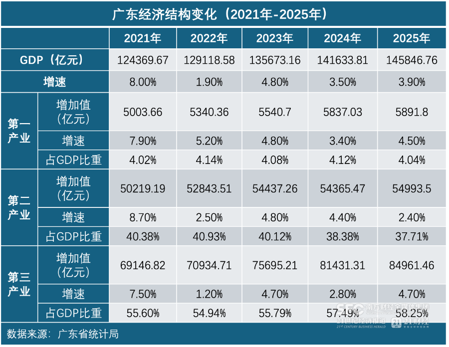 从一组数据上也可以直观看出这一趋势:2021年-2025年,广东第三产业增加值占全省GDP比重从55.60%整体上升至58.25%。2025年,广东全省服务业增加值同比增长4.7%,增速同比提高1.9个百分点,跑赢GDP增速0.8个百分点。