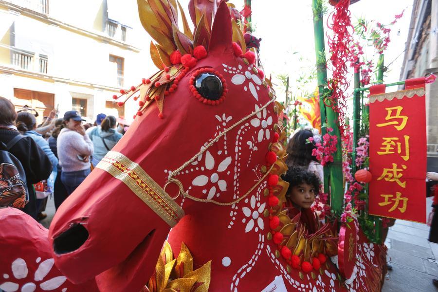 这是2月7日在墨西哥首都墨西哥城拍摄的参加马年生肖装饰大赛暨巡游表演的作品。墨西哥首都墨西哥城历史中心区7日举行马年生肖装饰大赛暨巡游表演,吸引上万名民众到场观看,近距离感受中国马年春节的浓厚节庆氛围。新华社发(弗朗西斯科·卡涅多摄)