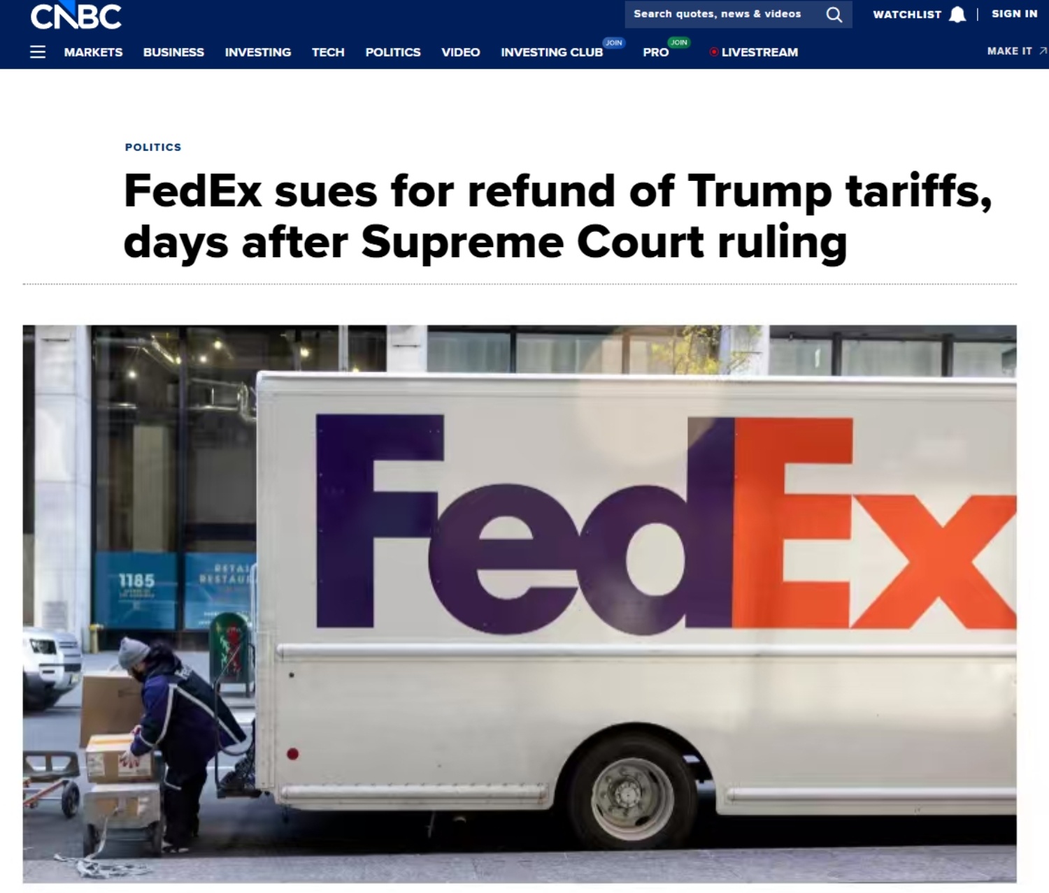 当地时间2月23日,全球运输企业联邦快递(FedEx)起诉美国政府要求退还关税款项。联邦快递已向美国国际贸易法院提起诉讼,请求全额退还根据《国际紧急经济权力法》征收的全部关税。