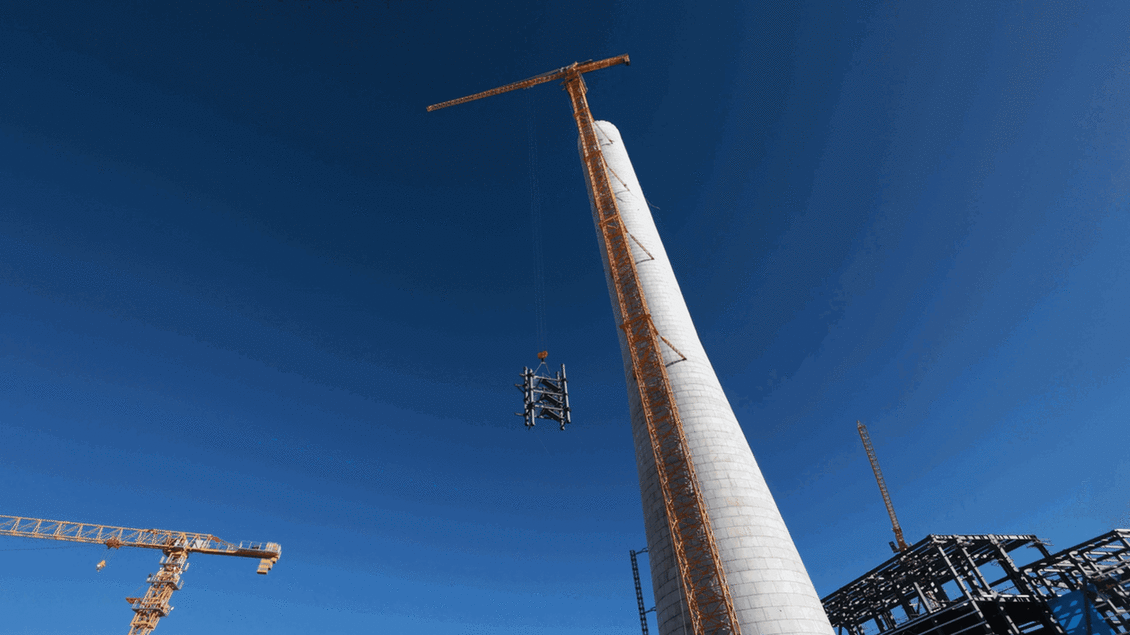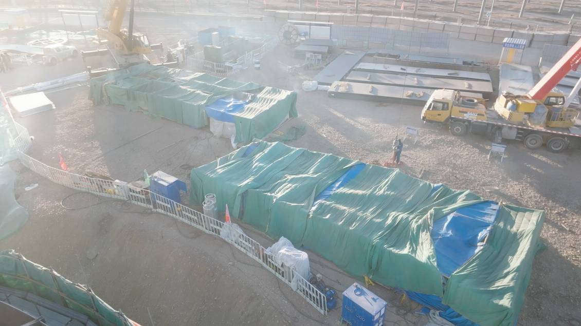临近春节,吸热塔内正在进行一场“搭积木”,恶劣的自然环境给施工设置三大难关。1月24日,刚放好第1节,工地上就刮起了强风。