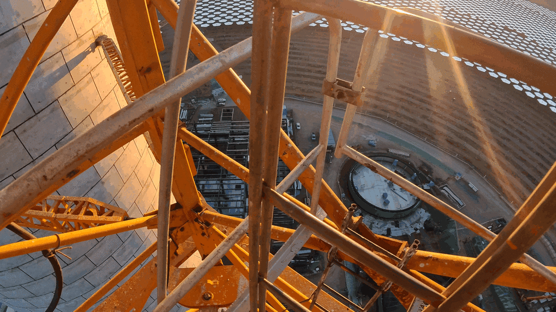 熔盐能把太阳能转化的热能储存起来,让电站在夜间也能持续发电。工人们要用16节钢结构搭建起27层平台,每节钢结构从塔外通过塔吊往里吊装。冬季高原每天下午经常刮大风,第二节的吊装选在上午,可作业平台还没焊完,眼看着要起风,塔吊司机尹家兵抓紧就位。
