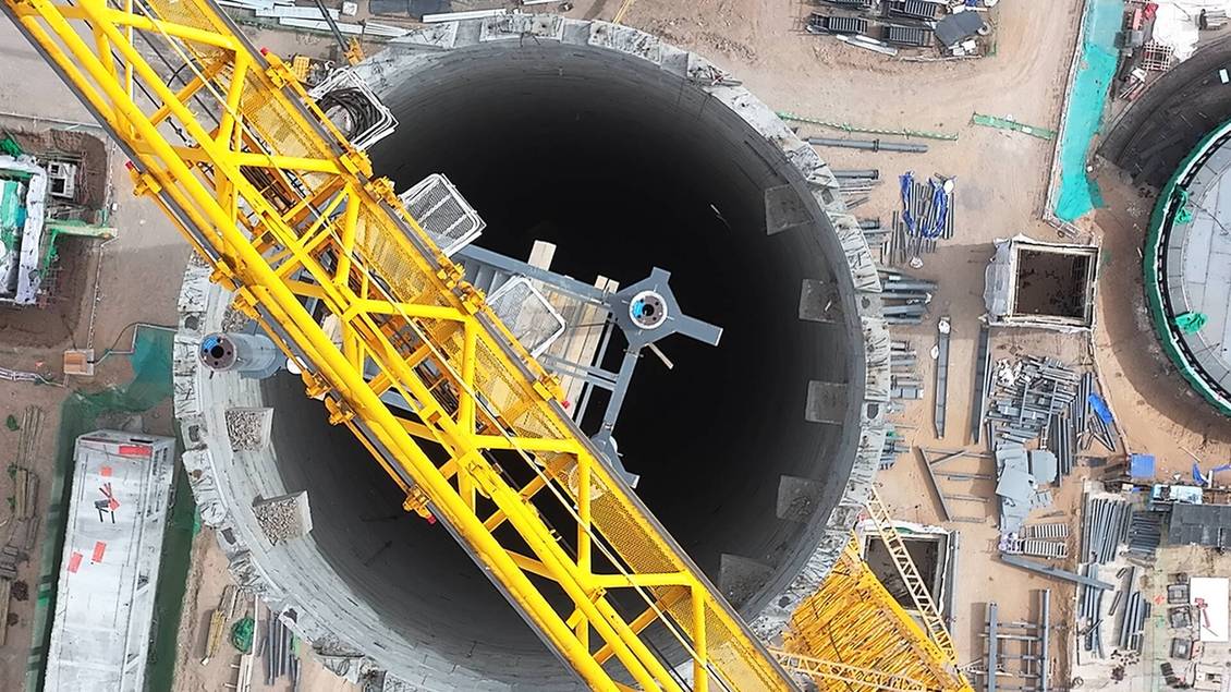 在底部察看的崔荣林看着手心发汗,虽然他已经安排一位安全员到塔顶盯着,但还是放心不下。当钢结构即将下放的时候,他升起一架无人机,让无人机飞到吸热塔顶正中旋停,无人机的实时回传图像清楚记录下放过程。一旦发现险情,管理人员及时用对讲机与工人沟通,确保第二节钢结构从塔中心安全下落到底部,并与第1节钢结构做好对接。