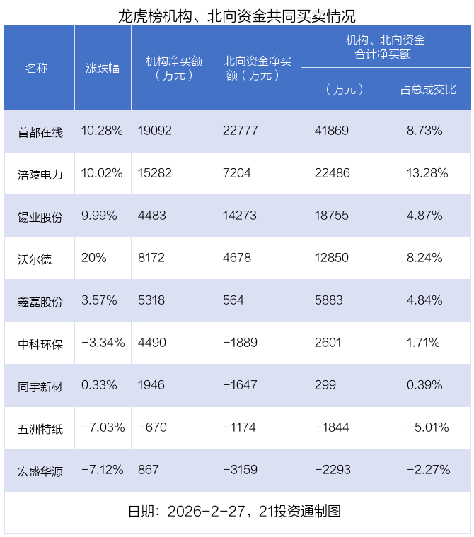值得注意的是,机构和北向资金共同净买入了首都在线、锡业股份、涪陵电力、沃尔德、鑫磊股份等5股;共同净卖出了五洲特纸;在同宇新材,中科环保,宏盛华源上出现分歧,机构净买入同宇新材1945.95万元,北向资金净卖出1647.33万元;机构净买入中科环保4489.87万元,北向资金净卖出1888.97万元;机构净买入宏盛华源866.69万元,北向资金净卖出3159.27万元。