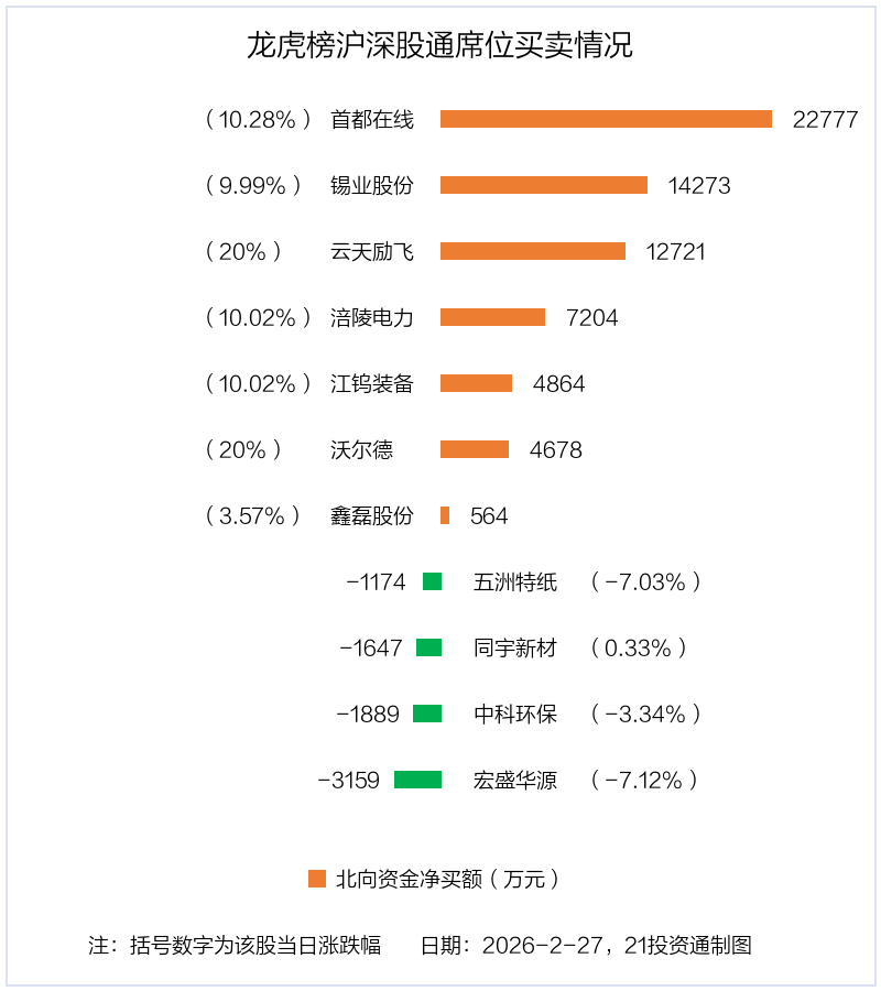 2月27日,北向资金参与龙虎榜中的个股共有11只,合计净买入5.92亿元。其中沪股通净买入4 股,净卖出2 股,合计净买入2.51亿元;深股通净买入3 股,净卖出2 股,合计净买入3.41亿元。
