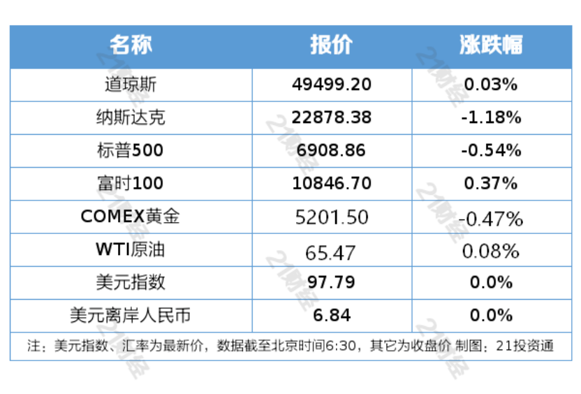 纽约股市三大股指2月26日涨跌不一。截至当天收盘,道琼斯工业平均指数比前一交易日上涨17.05点,收于49499.20点,涨幅为0.03%;标准普尔500种股票指数下跌37.27点,收于6908.86点,跌幅为0.54%;纳斯达克综合指数下跌273.70点,收于22878.38点,跌幅为1.18%。