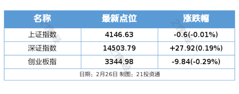 2月26日,市场探底回升,三大指数涨跌不一,创业板指盘中一度跌超1%,黄白线分化。截至收盘,沪指跌0.01%,深成指涨0.19%,创业板指跌0.29%。沪深两市成交额2.54万亿,较上一个交易日放量759亿。