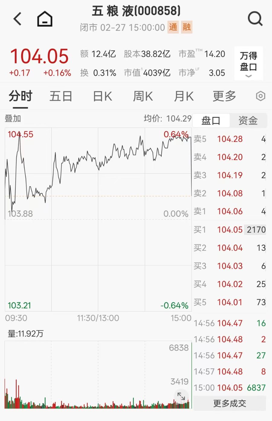 2月27日,五粮液(000858.SZ)股价微涨0.16%,报104.05元/股,最新总市值为4039亿元。