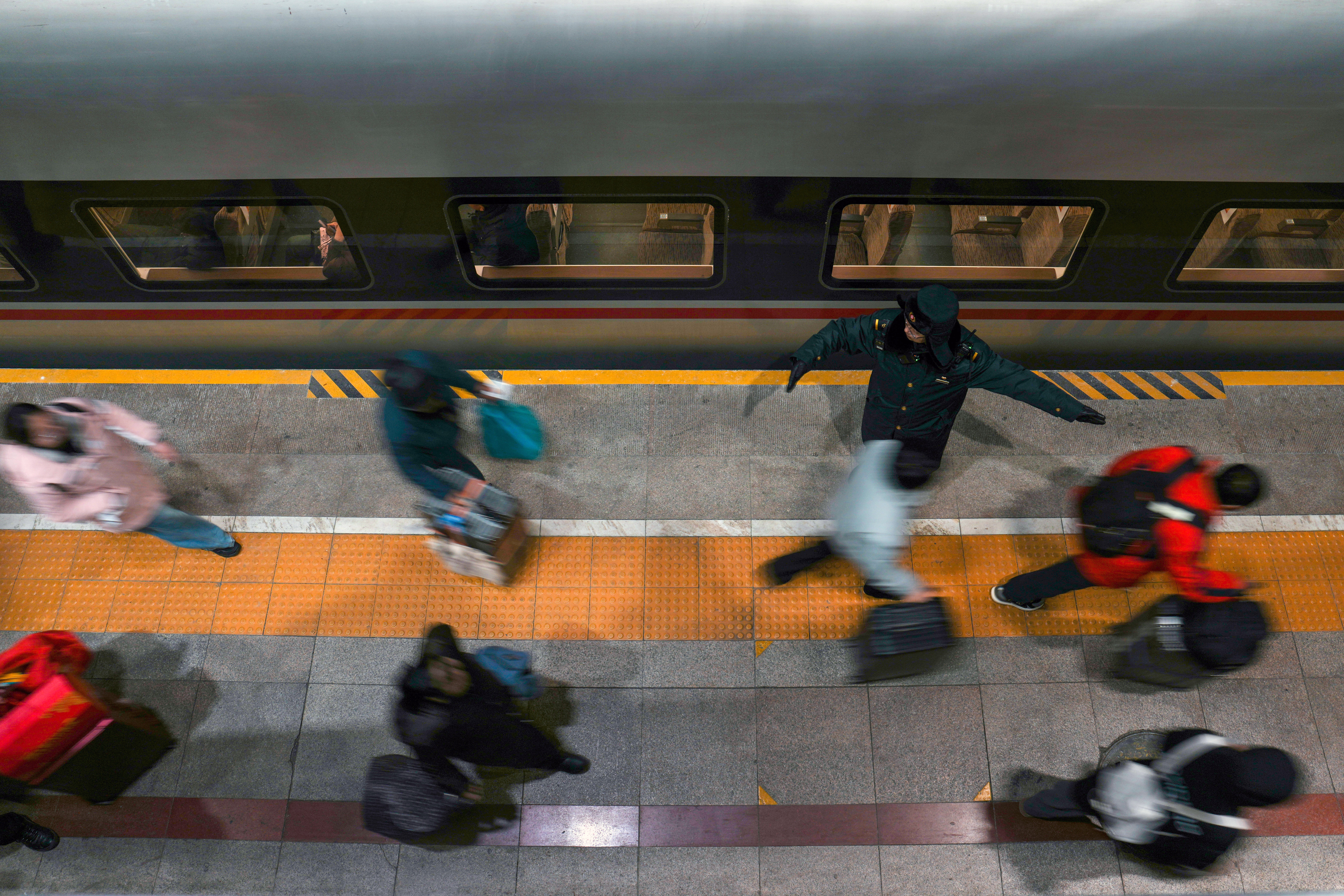 5时23分,G4021次列车载着204名旅客驶出上海虹桥站,向贵阳方向飞驰而去,开启春运返乡路。