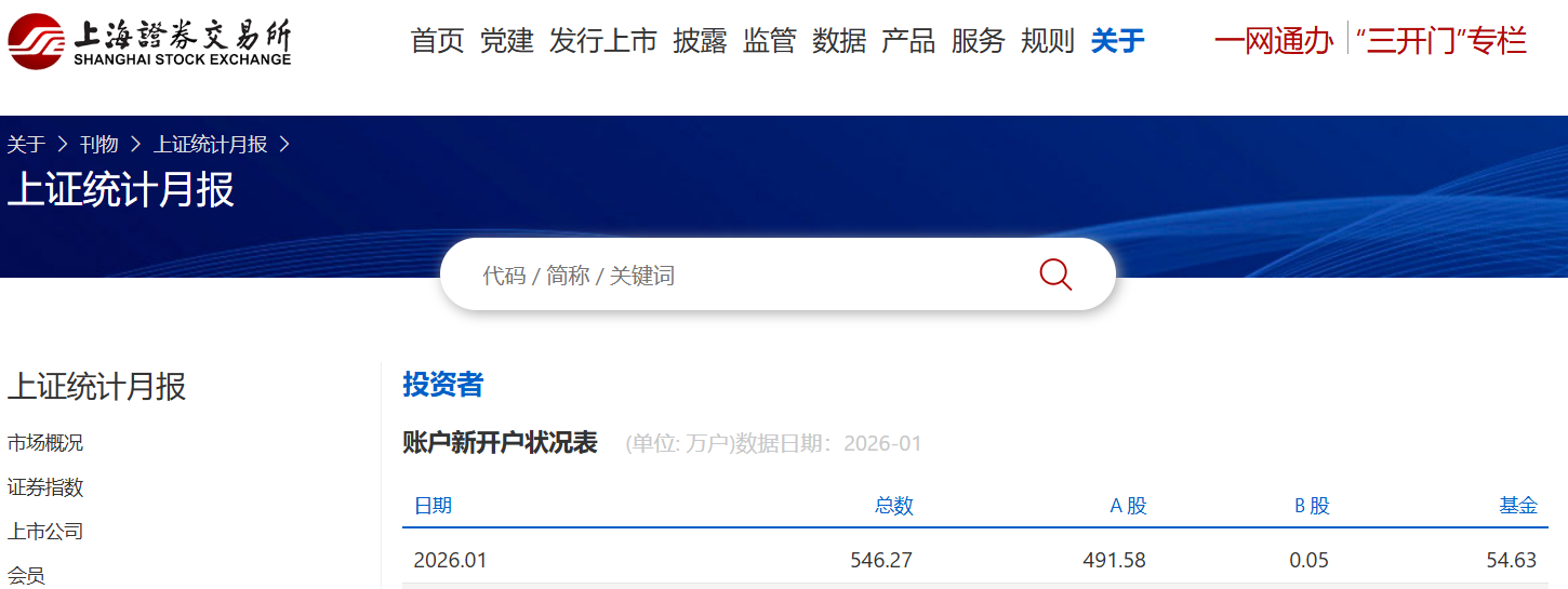 2月3日,上交所官网发布的数据显示,2026年1月A股新开户491.58万户,环比去年12月的259.67万户增长89%,同比2025年1月的157.0万户增长213%。