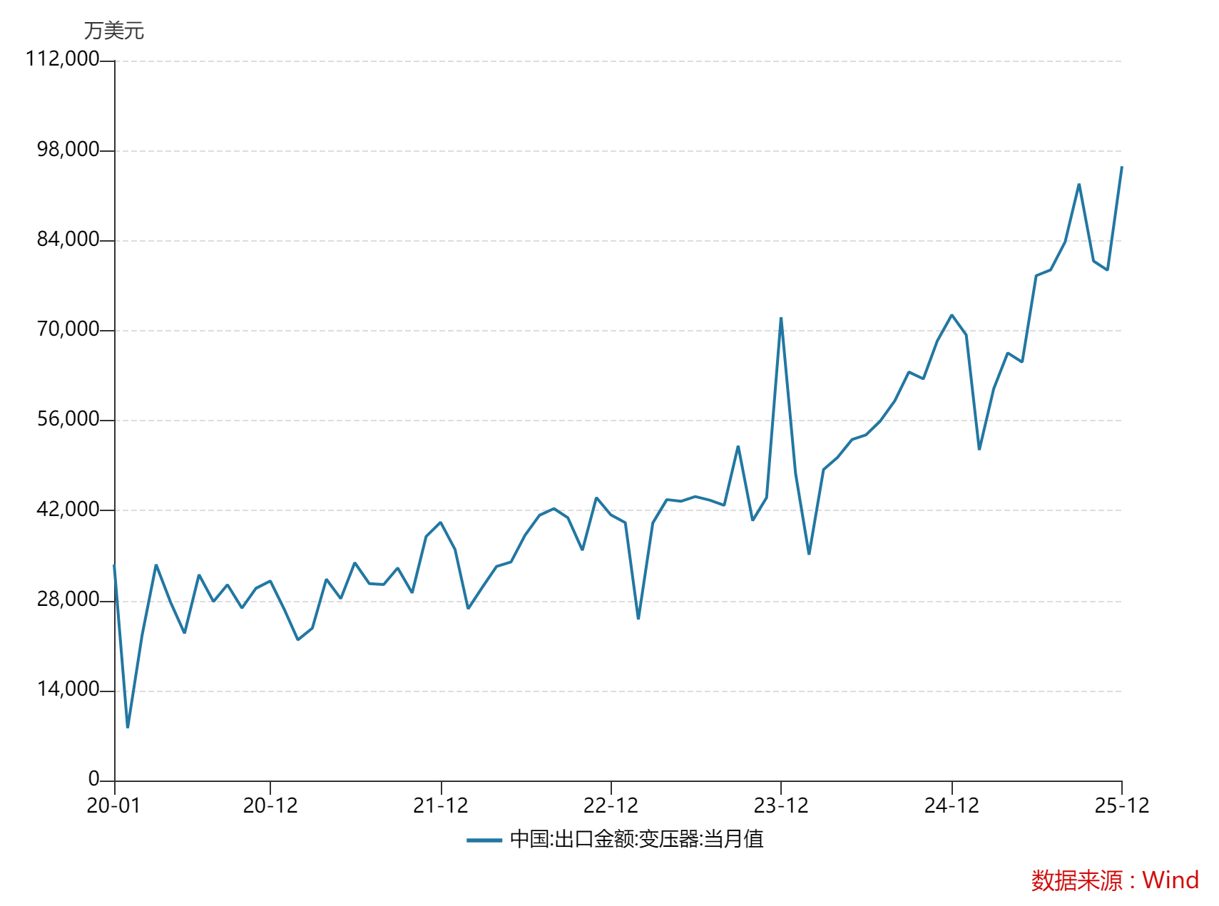 随之而来的是变压器出口量价齐升。根据电能革新数据,中国变压器出口均价已从2020年的1.2万美元/台升至2025年的2.08万美元/台,型号价格翻倍。据海关总署,我国的变压器出口金额从2021年的36.71亿美元飙升到2025年的90.37亿美元。