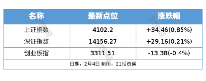 2月4日,市场探底回升,沪指重返4100点,深成指翻红,此前一度跌超1%,创业板指午后跌幅收窄。截至收盘,沪指涨0.85%,深成指涨0.21%,创业板指跌0.4%。沪深两市成交额2.48万亿,较上一个交易日缩量633亿。