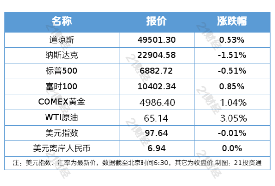 纽约股市三大股指2月4日涨跌不一。截至当天收盘,道琼斯工业平均指数比前一交易日上涨260.31点,收于49501.30点,涨幅为0.53%;标准普尔500种股票指数下跌35.09点,收于6882.72点,跌幅为0.51%;纳斯达克综合指数下跌350.61点,收于22904.58点,跌幅为1.51%。