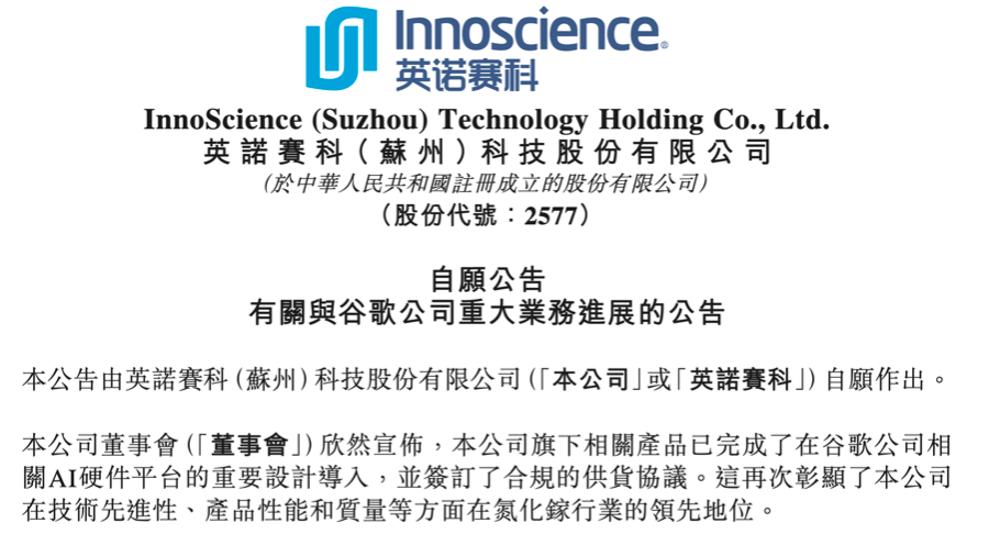 2月3日,英诺赛科发布《有关与谷歌公司重大业务进展的公告》:公司旗下氮化镓相关产品已成功完成在谷歌公司相关AI硬件平台的重要设计导入,并正式签订合规供货协议。二者此次合作,聚焦于AI服务器、数据中心等高增长潜力领域。根据公告内容,英诺赛科将基于当前项目开发与客户对接进展,积极与产业链合作伙伴深化协作,合规推进相关产品的商业化落地,充分满足谷歌在AI硬件领域的供应链需求,以及全球算力市场对高性能、高可靠性氮化镓产品的迫切需求。