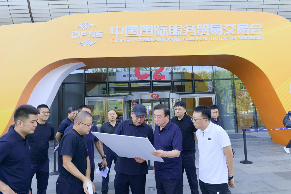 2023年8月28日,董亦军同志(前右二)在中国国际服务贸易交易会举办地,对交通服务保障工作进行现场踏勘。新华社发